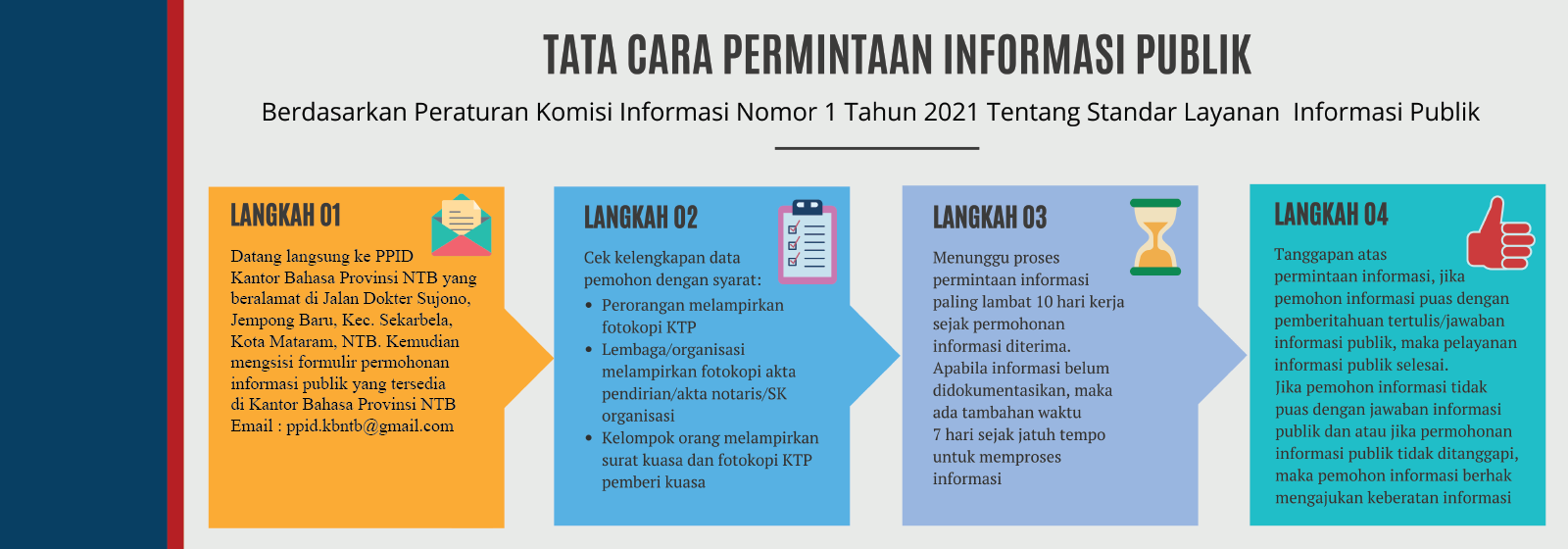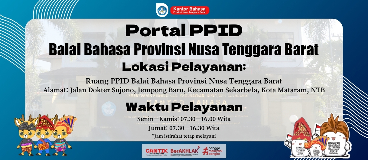 Setiap warga negara Indonesia memiliki hak untuk memperoleh informasi dari setiap Badan Publik, di mana hak tersebut telah dijamin oleh konstitusi dan Undang-Undang. Untuk itu, sebagai salah satu Badan Publik, Balai Bahasa Provinsi NTB telah membentuk Tim Pejabat Pengelola Informasi & Dokumentasi (PPID) yang akan memberikan pelayanan informasi seluas-luasnya bagi masyarakat untuk mengetahui perkembangan bahasa dan sastra, khususnya di NTB.
