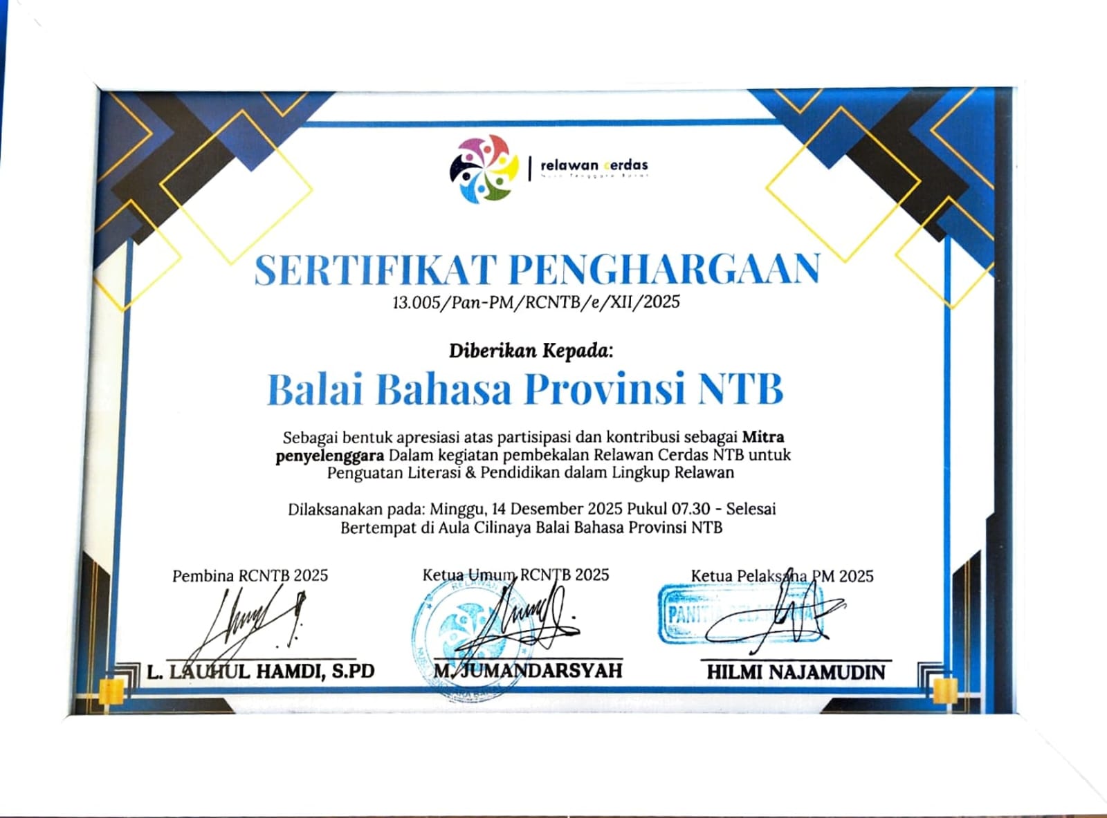 | Penghargaan Mitra Kerja Sama dari Komunitas Relawan Cerdas NTB |