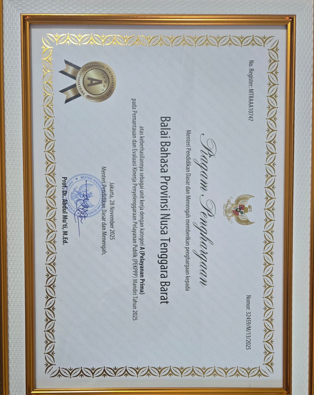 | Piagam Penghargaan dari Prodi Bastrindo Universitas Mataram |