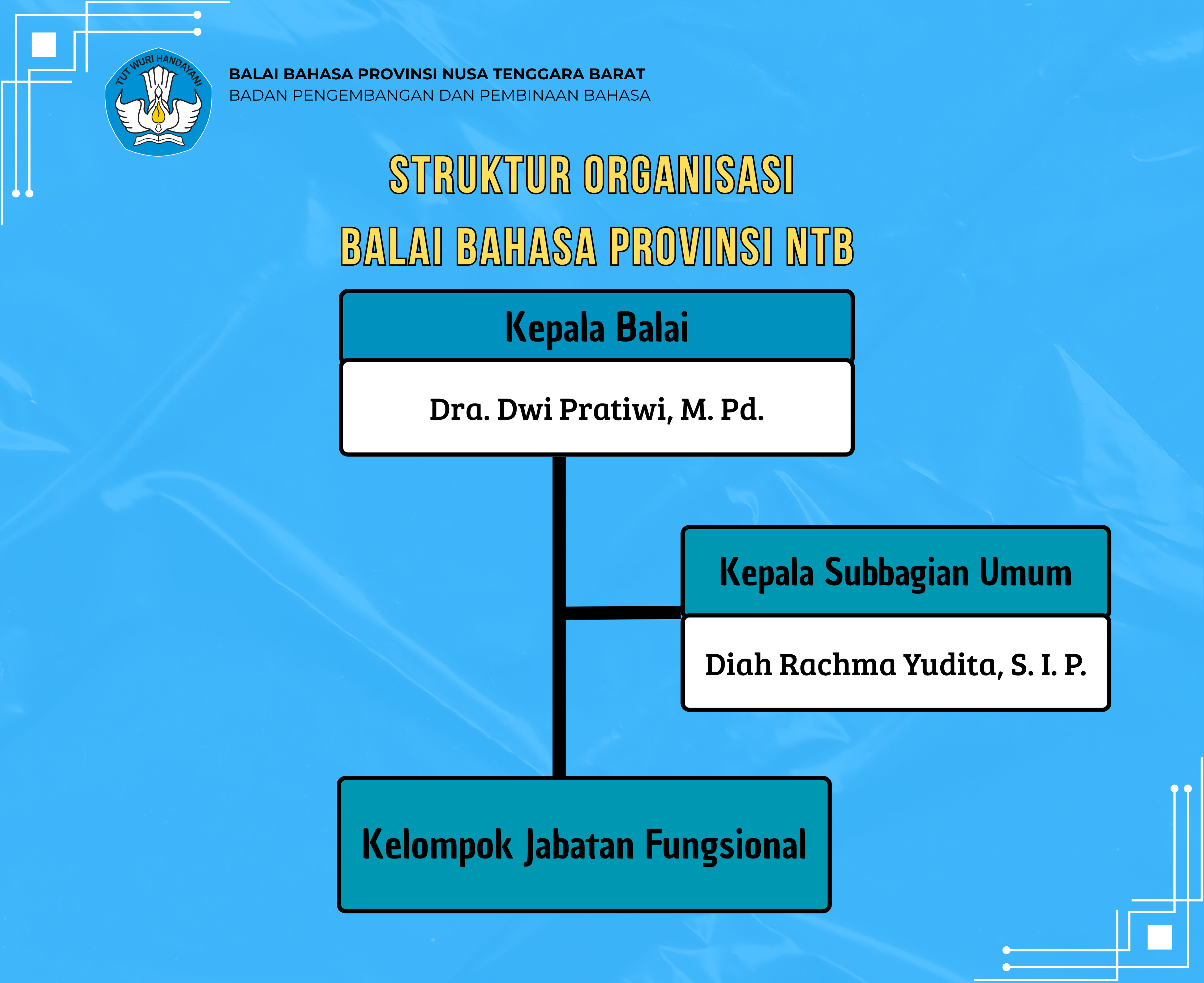 Susunan Organisasi Balai Bahasa Provinsi Nusa Tenggara Barat terdiri atas Kepala, Kepala Subbagian Umum, dan Kelompok Jabatan Fungsional.